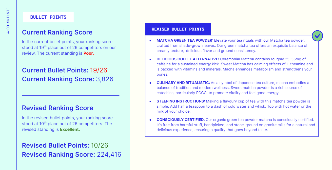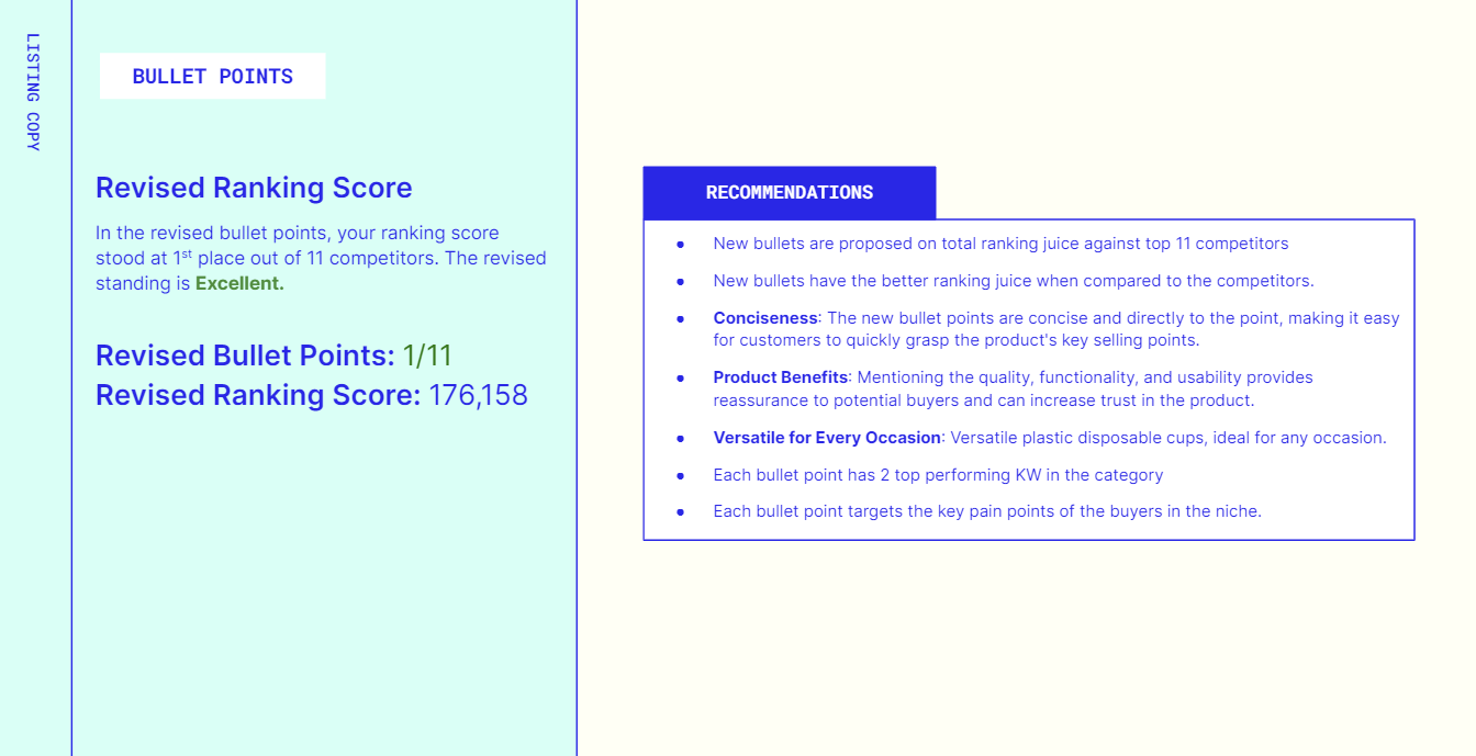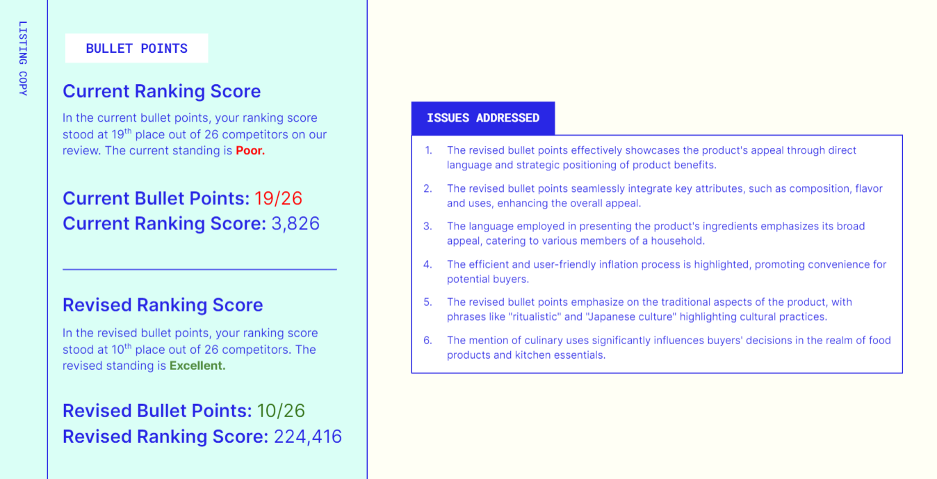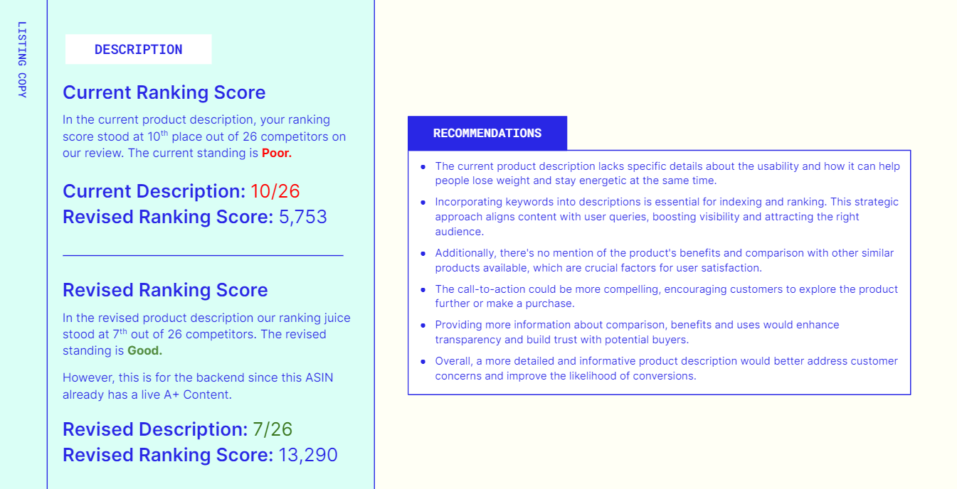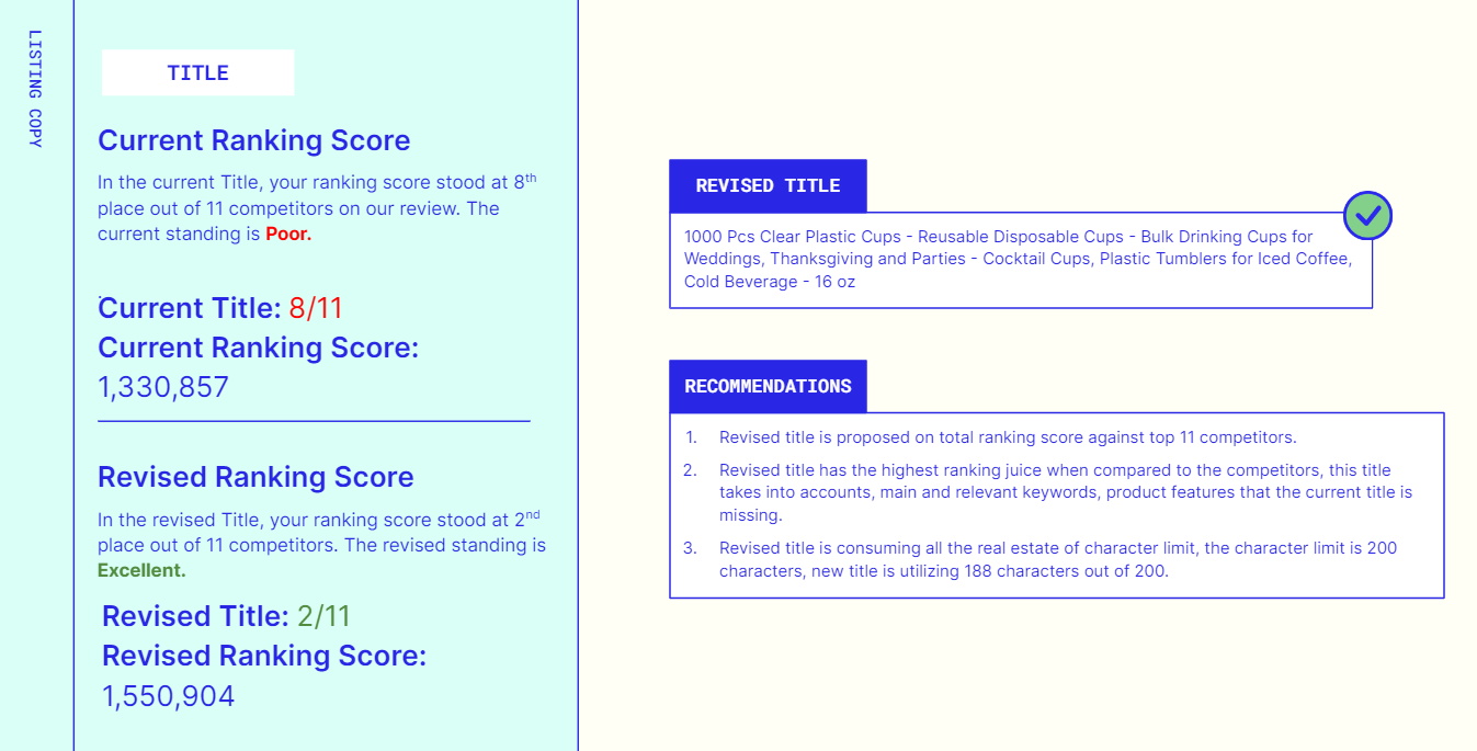 - The report will showcase current and revised suggestions on your entire listing.